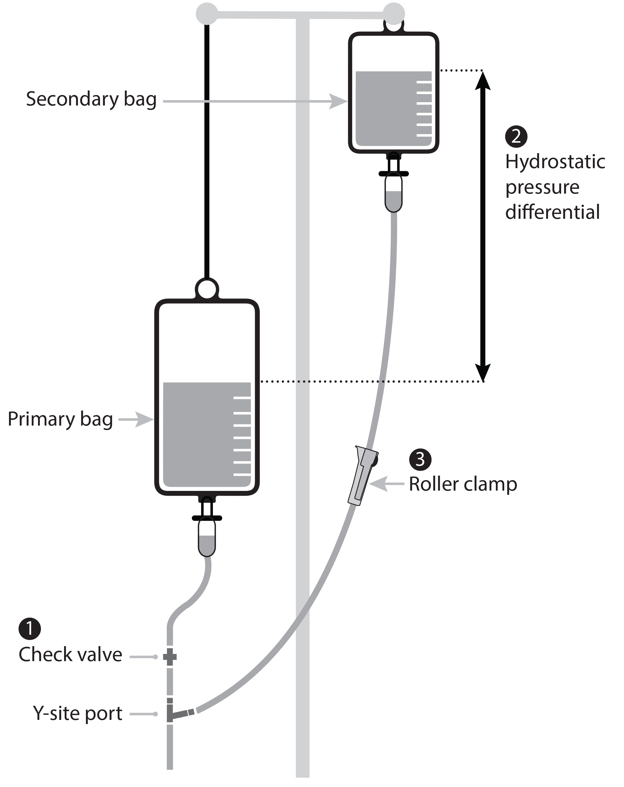 - A minimum head-height differential (as specified by the pump manufacturer) between the primary fluid level and secondary fluid level throughout the duration of secondary infusion