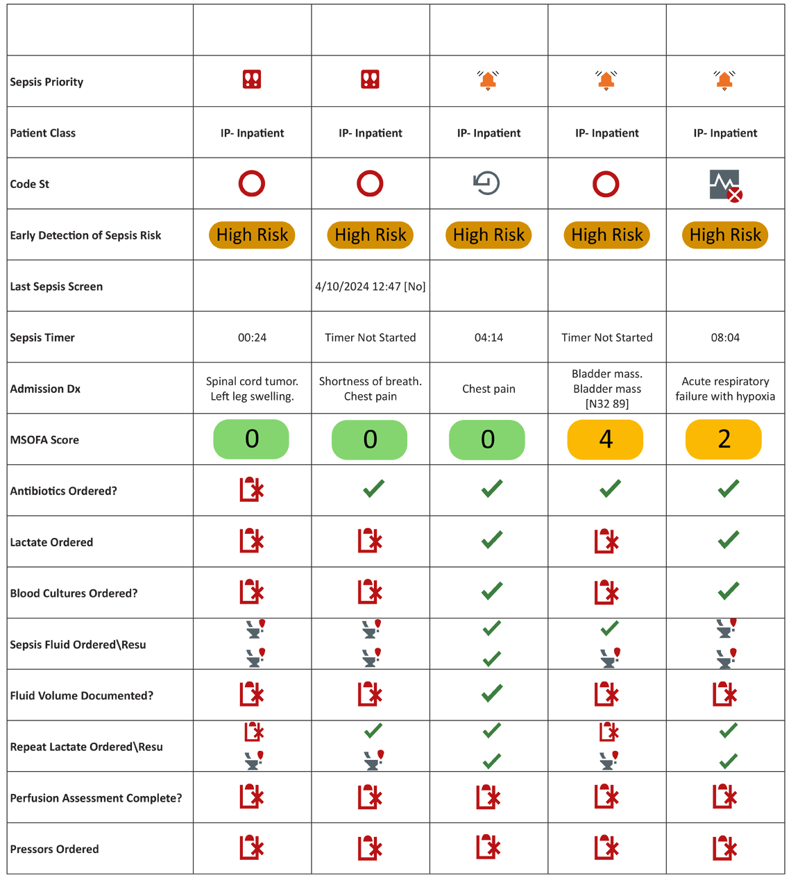 We created a list in the EMR that displayed all the high-risk patients with sepsis in our health system. This list was generated by an algorithm that identified patients who had been risk stratified by the predictive model and narrowed the list to those at highest risk. Our team was involved in developing the list, which displays completed tasks such as lactates, antibiotics and blood cultures. The list allows our team to quickly visualize what was completed and prioritize patients who are not currently on antibiotics.